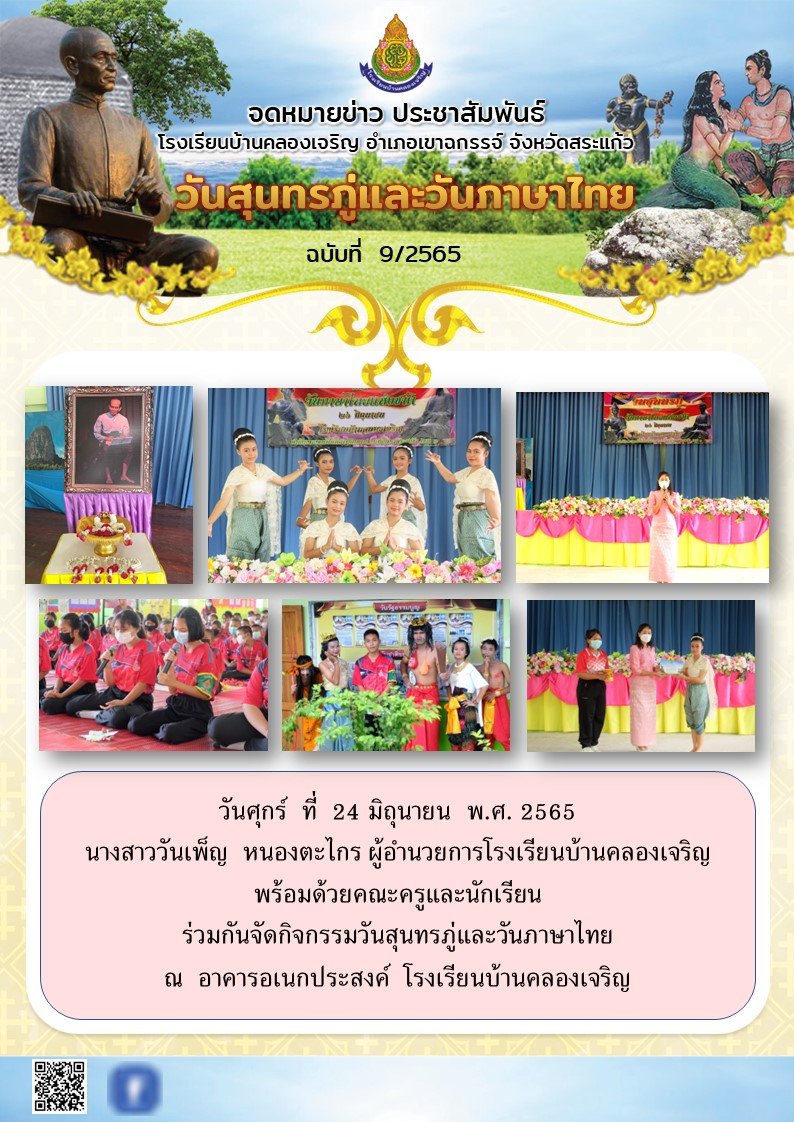| วันศุกร์ ที่ 24 มิถุนายน พ.ศ. 2565 นางสาววันเพ็ญ หนองตะไกร ผู้อำนวยการโรงเรียนบ้านคลองเจริญ พร้อมด้วยคณะครูและนักเรียน ร่วมกันจัดกิจกรรมวันสุนทรภู่และวันภาษาไทย ณ อาคารอเนกประสงค์ โรงเรียนบ้านคลองเจริญ |