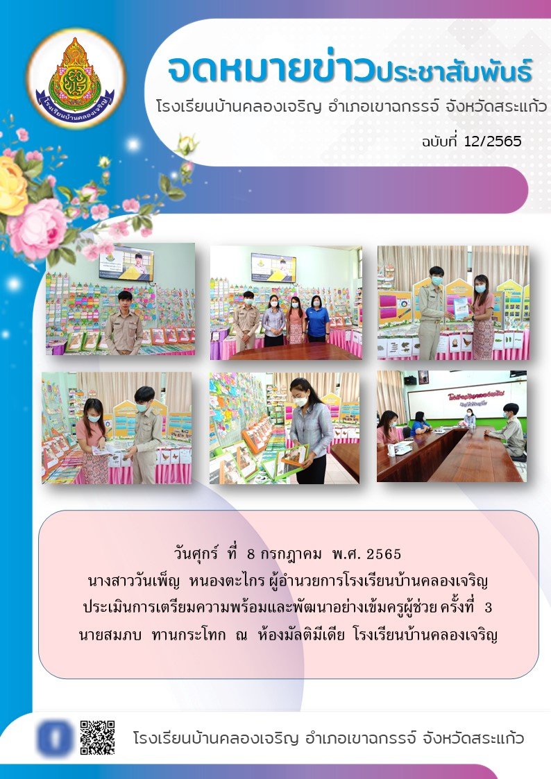 | วันศุกร์ที่ 8 กรกฎาคม 2565 ประเมินการเตรียมความพร้อมและพัฒนาอย่างเข้มครูผู้ช่วยครั้งที่ 3 ครูสมภบ ทานกระโทก ณ ห้องมัลติมีเดีย โรงเรียนบ้านคลองเจริญ |