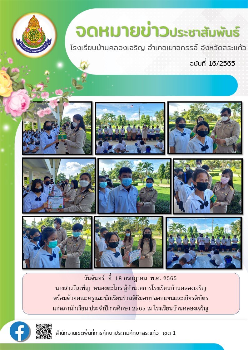 | วันจันทร์ ที่ 18 กรกฎาคม พ.ศ. 2565 นางสาววันเพ็ญ หนองตะไกร ผู้อำนวยการโรงเรียนบ้านคลองเจริญ พร้อมด้วยคณะครูและนักเรียนร่วมพิธีมอบปลอกแขนและเกียรติบัตรแก่สภานักเรียน ประจำปีการศึกษา 2565 ณ โรงเรียนบ้านคลองเจริญ |