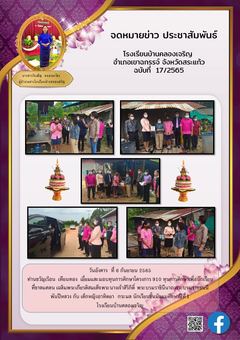 | วันอังคาร ที่ 6 กันยายน 2565 ท่านขวัญเรือน เทียนทอง เยี่ยมและมอบทุนการศึกษาโครงการ 910 ทุนการศึกษาเพื่อนักเรียนที่ขาดแคลน เฉลิมพระเกียรติสมเด็จพระนางเจ้าสิริกิติ์ พระบรมราชินีนาถ พระบรมราชชนนี พันปีหลวง กับ เด็กหญิงอาทิตยา กระมล นักเรียนชั้นมัธยมศึกษาปีที่ 1 โรงเรียนบ้านคลองเจริญ |