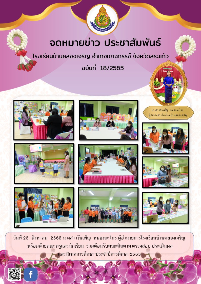 | วันที่ 25 สิงหาคม 2565 นางสาววันเพ็ญ หนองตะไกร ผู้อำนวยการโรงเรียนบ้านคลองเจริญ พร้อมด้วยคณะครูและนักเรียน ร่วมต้อนรับคณะติดตาม ตรวจสอบ ประเมินผล และนิเทศการศึกษา ประจำปีการศึกษา 2565 |