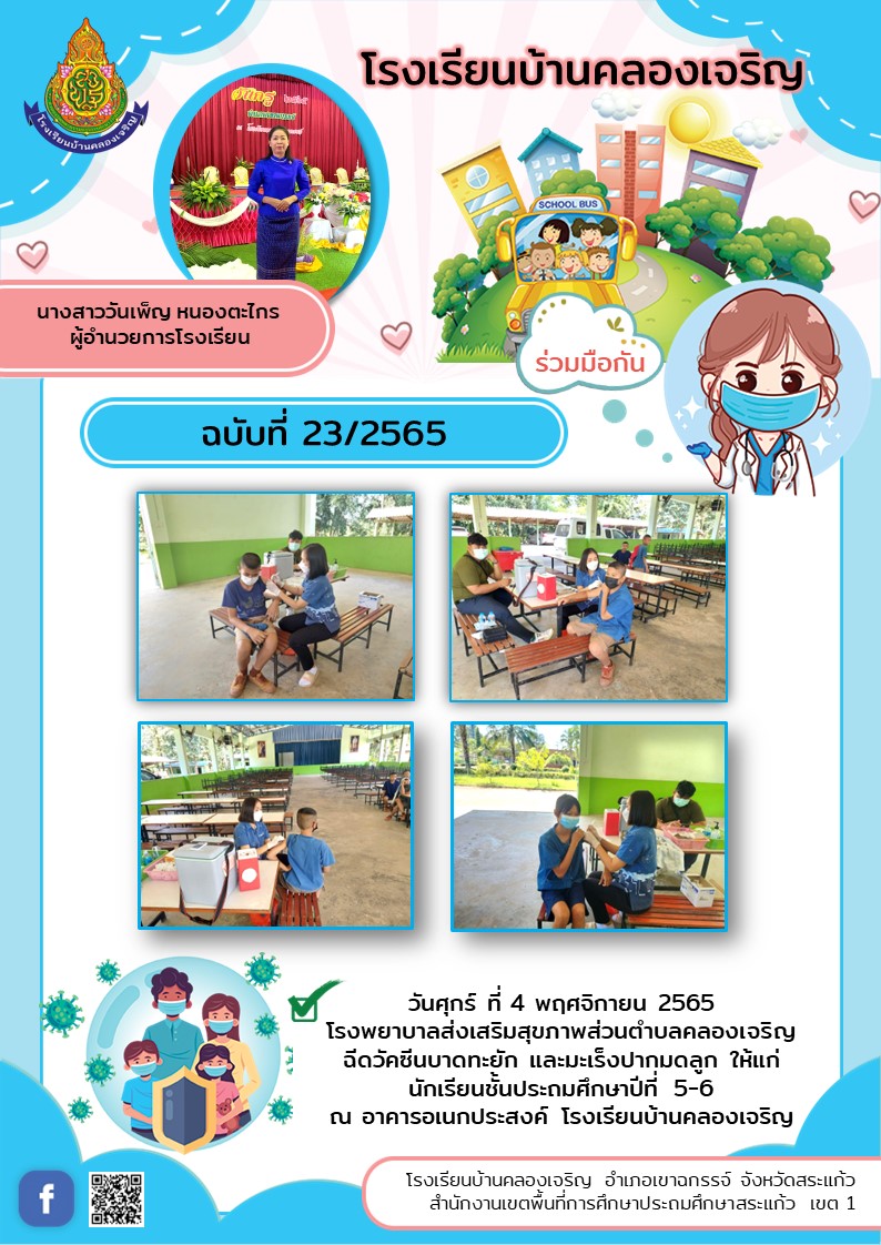 | วันศุกร์ ที่ 4 พฤศจิกายน 2565 โรงพยาบาลส่งเสริมสุขภาพส่วนตำบลคลองเจริญ ฉีดวัคซีนบาดทะยัก และมะเร็งปากมดลูก ให้แก่นักเรียนชั้นประถมศึกษาปีที่ 5-6 ณ อาคารอเนกประสงค์ โรงเรียนบ้านคลองเจริญ |