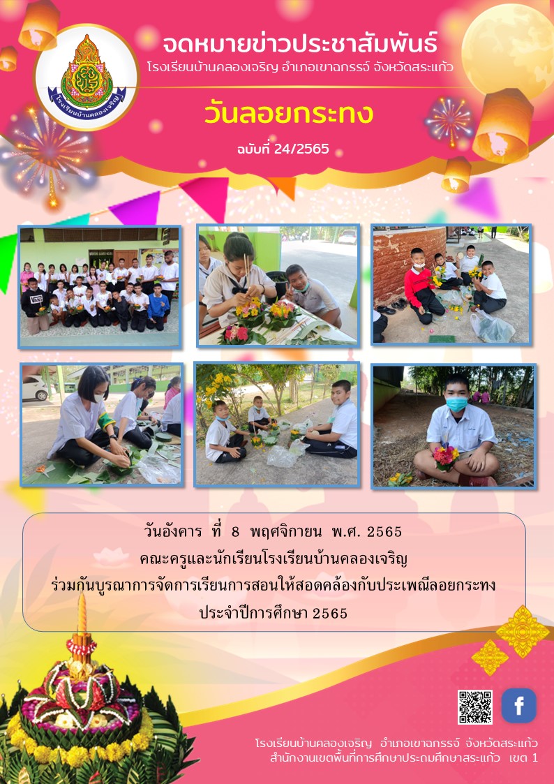 | วันอังคาร ที่ 8 พฤศจิกายน พ.ศ. 2565 คณะครูและนักเรียนโรงเรียนบ้านคลองเจริญ ร่วมกันบูรณาการจัดการเรียนการสอนให้สอดคล้องกับประเพณีลอยกระทง ประจำปีการศึกษา 2565 |