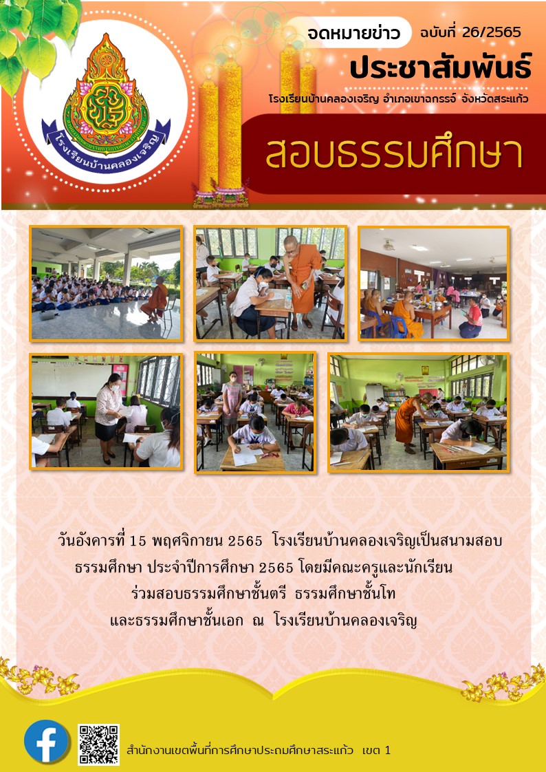 | วันอังคารที่ 15 พฤศจิกายน 2565 โรงเรียนบ้านคลองเจริญเป็นสนามสอบธรรมศึกษา ประจำปีการศึกษา 2565 โดยมีคณะครูและนักเรียนร่วมสอบธรรมศึกษาชั้นตรี ธรรมศึกษาชั้นโทและธรรมศึกษาชั้นเอก ณ โรงเรียนบ้านคลองเจริญ |