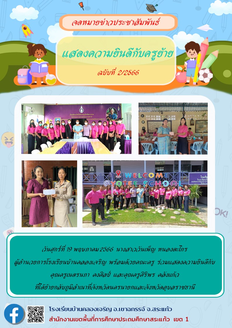 | วันศุกร์ที่ 19 พฤษภาคม 2566 นางสาววันเพ็ญ หนองตะไกร ผู้อำนวยการโรงเรียนบ้านคลองเจริญ พร้อมด้วยคณะครู ร่วมแสดงความยินดีกับคุณครูเนตรนภา คงศิลป์ และคุณครูศิริพร คลังแก้ว ที่ได้ย้ายกลับภูมิลำเนาที่จังหวัดนครนายกและจังหวัดอุบลราชธานี |