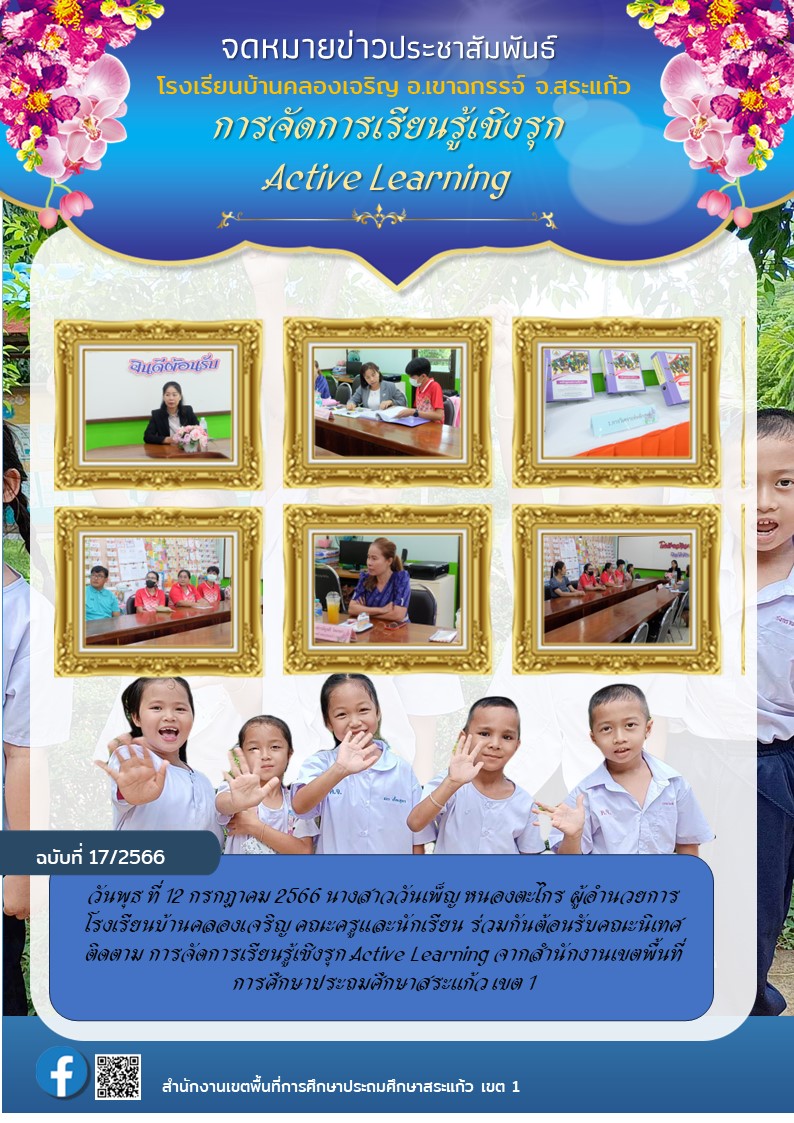 | วันพุธ ที่ 12 กรกฎาคม 2566 นางสาววันเพ็ญ หนองตะไกร ผู้อำนวยการโรงเรียนบ้านคลองเจริญ คณะครูและนักเรียน ร่วมกันต้อนรับคณะนิเทศ ติดตาม การจัดการเรียนรู้เชิงรุก Active Learning จากสำนักงานเขตพื้นที่การศึกษาประถมศึกษาสระแก้ว เขต 1 |