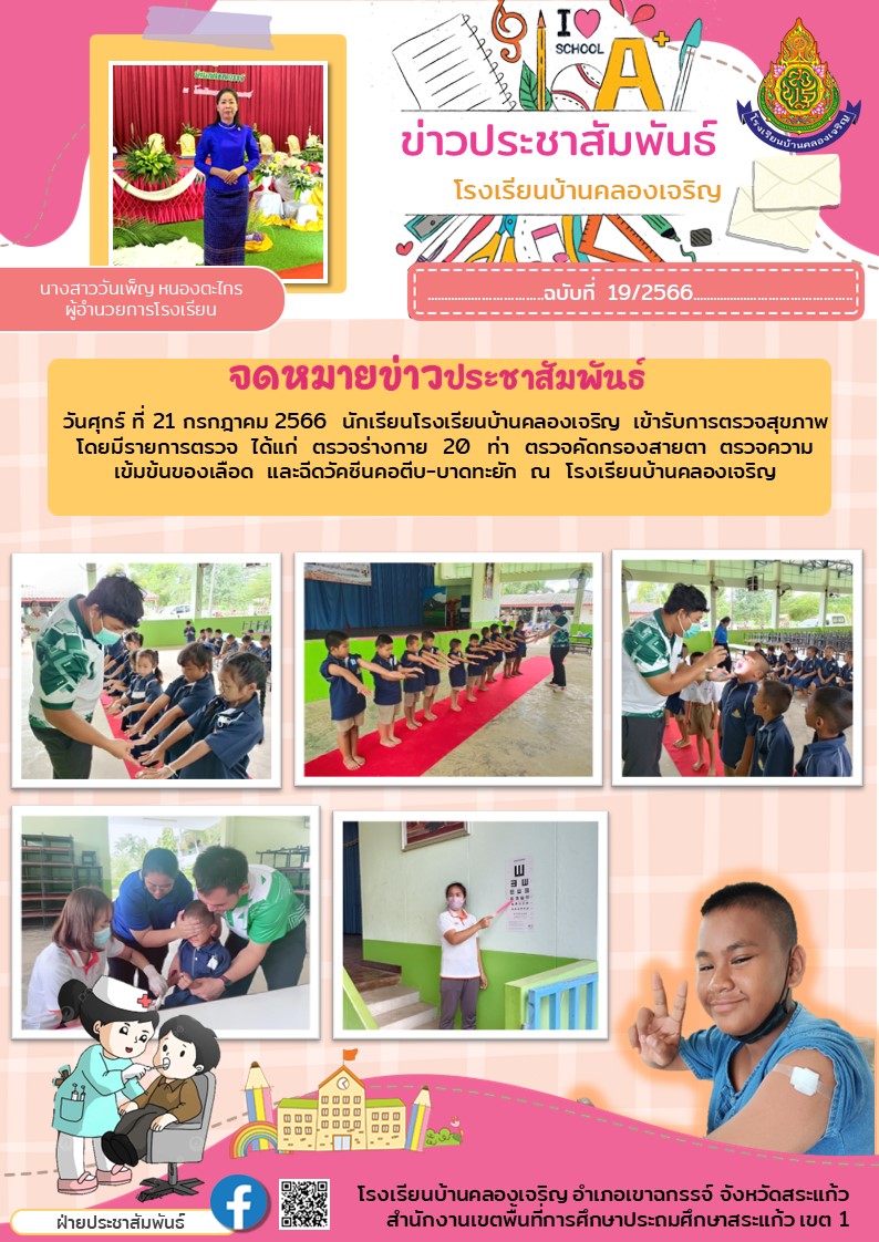 | วันศุกร์ ที่ 21 กรกฎาคม 2566 โรงพยาบาลส่งเสริมสุขภาพส่วนตำบลคลองเจริญ เข้าตรวจคัดกรองสุขภาพเด็กวัยเรียน ได้แก่ คัดกรองสายตา การตรวจความเข้มข้นของเลือด ตรวจร่างกาย 10 ท่า ให้กับนักเรียนชั้นอนุบาล 2 - ชั้นมัธยมศึกษาปีที่ 3 จำนวน 264 คน ณ อาคารอเนกประสงค์โรงเรียนบ้านคลองเจริญ |