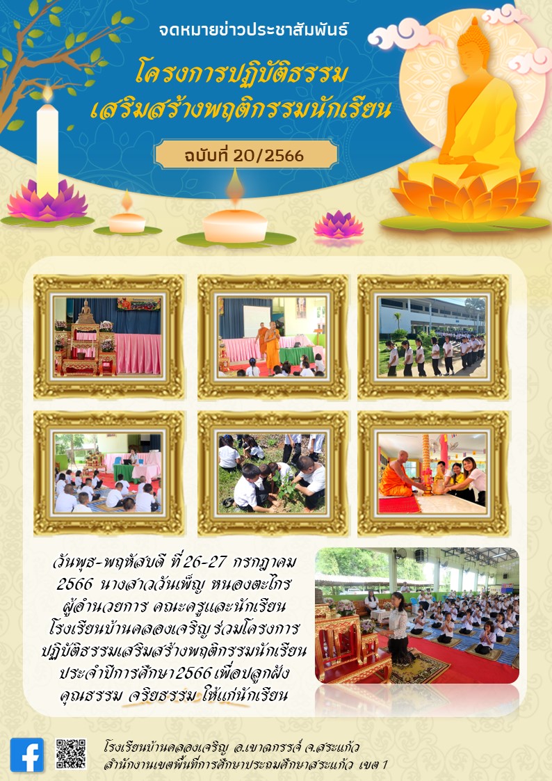 | วันพุธ-พฤหัสบดี ที่ 26-27 กรกฎาคม 2566 นางสาววันเพ็ญ หนองตะไกร ผู้อำนวยการ คณะครูและนักเรียนโรงเรียนบ้านคลองเจริญ ร่วมโครงการปฏิบัติธรรมเสริมสร้างพฤติกรรมนักเรียน ประจำปีการศึกษา 2566 เพื่อปลูกฝังคุณธรรม จริยธรรม ให้แก่นักเรียน |