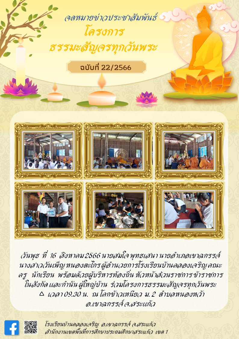 วันพุธ ที่ 16 สิงหาคม 2566 นายสมใจ พุทธเสนา นายอำเภอเขาฉกรรจ์ นางสาววันเพ็ญ หนองตะไกร ผู้อำนวยการโรงเรียนบ้านคลองเจริญ คณะครู นักเรียน พร้อมด้วยผู้บริหารท้องถิ่น หัวหน้าส่วนราชการ ข้าราชการในสังกัด และกำนัน ผู้ใหญ่บ้าน ร่วมโครงการธรรมะสัญจรทุกวันพระ เวลา 09.30 น. ณ โคกข้าวเหนียว ม. 2 ตำบลหนองหว้า อ.เขาฉกรรจ์ จ.สระแก้ว |