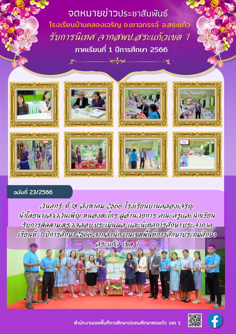 | วันศุกร์ ที่ 18 สิงหาคม 2566 โรงเรียนบ้านคลองเจริญ นำโดยนางสาววันเพ็ญ หนองตะไกร ผู้อำนวยการ คณะครูและนักเรียนรับการติดตาม ตรวจสอบ ประเมินผล และนิเทศการศึกษา ประจำภาคเรียนที่ 1 ปีการศึกษา 2566 จากสำนักงานเขตพื้นที่การศึกษาประถมศึกษาสระแก้ว เขต 1 |