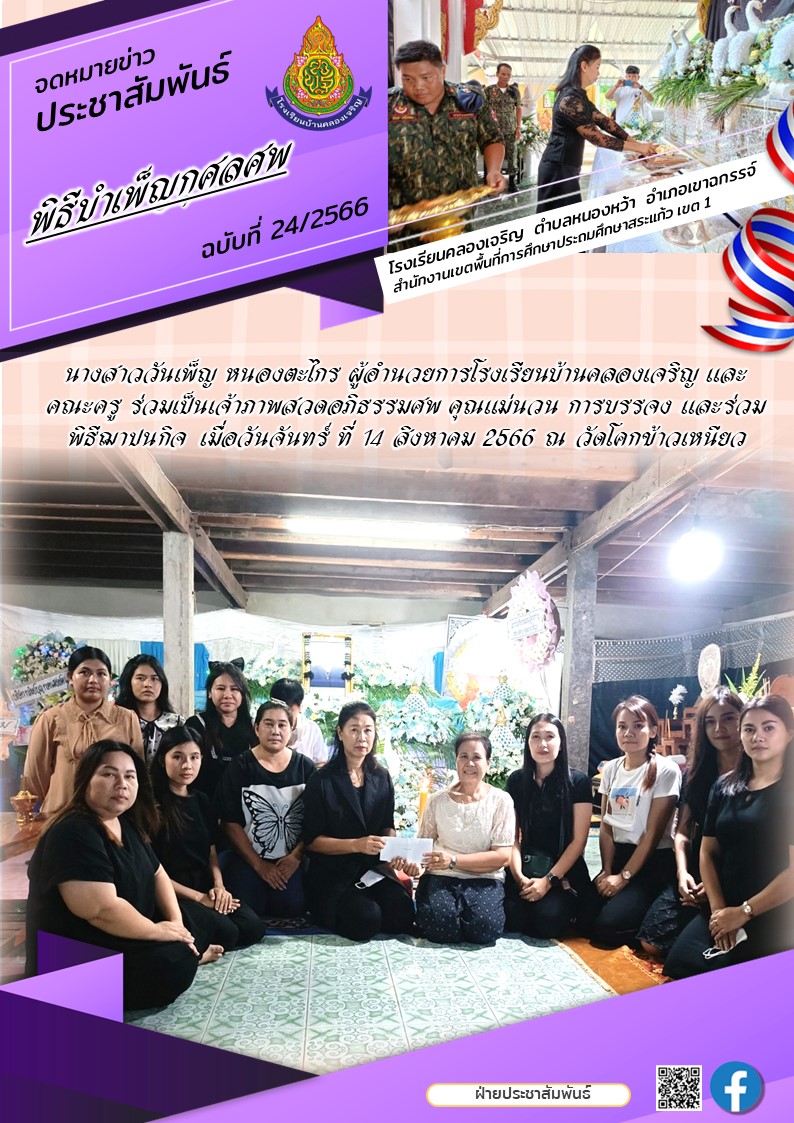 | นางสาววันเพ็ญ หนองตะไกร ผู้อำนวยการโรงเรียนบ้านคลองเจริญ และคณะครู ร่วมเป็นเจ้าภาพสวดอภิธรรมศพ คุณแม่นวน การบรรจง และร่วมพิธีฌาปนกิจ เมื่อวันจันทร์ ที่ 14 สิงหาคม 2566 ณ วัดโคกข้าวเหนียว |