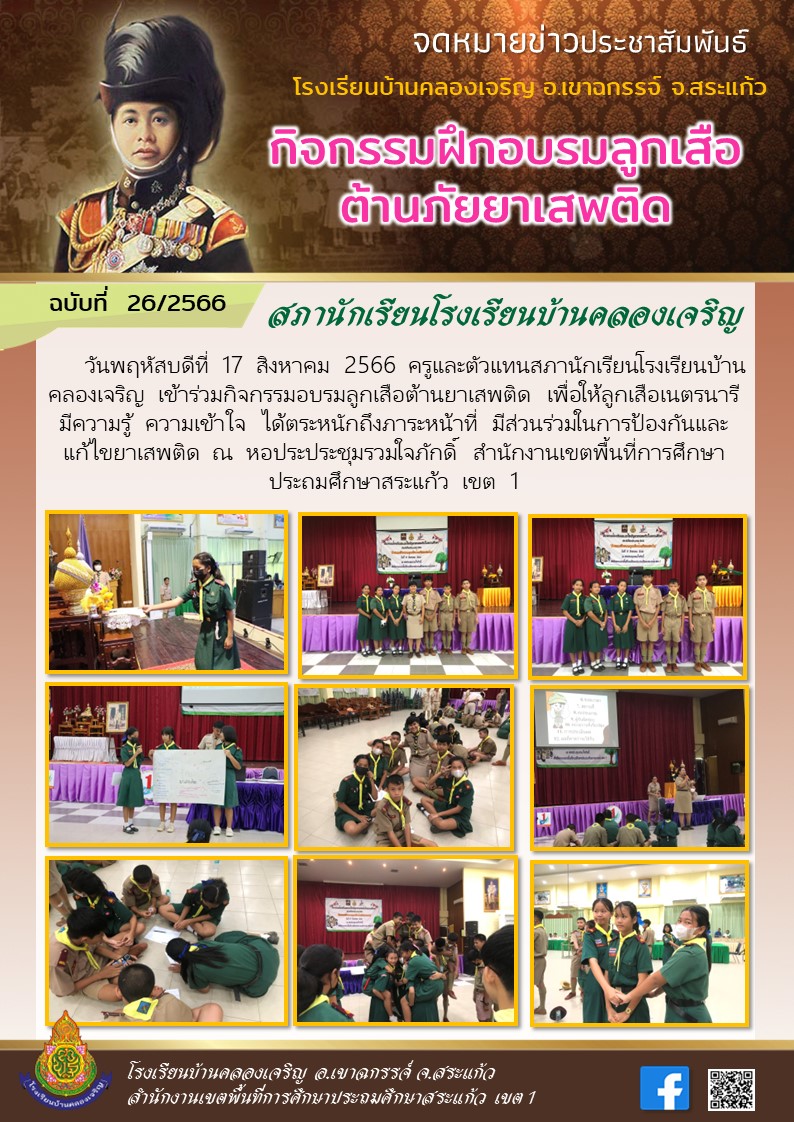 | วันพฤหัสบดีที่ 17 สิงหาคม 2566 ครูและตัวแทนสภานักเรียนโรงเรียนบ้านคลองเจริญ เข้าร่วมกิจกรรมอบรมลูกเสือต้านยาเสพติด เพื่อให้ลูกเสือเนตรนารี มีความรู้ ความเข้าใจ ได้ตระหนักถึงภาระหน้าที่ มีส่วนร่วมในการป้องกันและแก้ไขยาเสพติด ณ หอประประชุมรวมใจภักดิ์ สำนักงานเขตพื้นที่การศึกษาประถมศึกษาสระแก้ว เขต 1 |