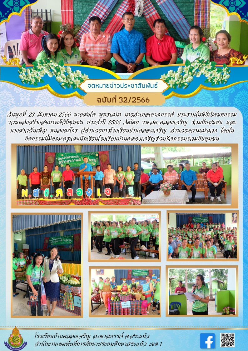 | วันพุธที่ 23 สิงหาคม 2566 นายสมใจ พุทธเสนา นายอำเภอเขาฉกรรจ์ ประธานในพิธีเปิดมหกรรมรวมพลังสร้างสุขภาพดีวิถีชุมชน ประจำปี 2566 จัดโดย รพ.สต..คลองเจริญ ร่วมกับชุมชน และนางสาววันเพ็ญ หนองตะไกร ผู้อำนวยการโรงเรียนบ้านคลองเจริญ อำนวยความสะดวก โดยในกิจกรรมนี้มีคณะครูและนักเรียนโรงเรียนบ้านคลองเจริญร่วมกิจกรรมร่วมกับชุมชน |