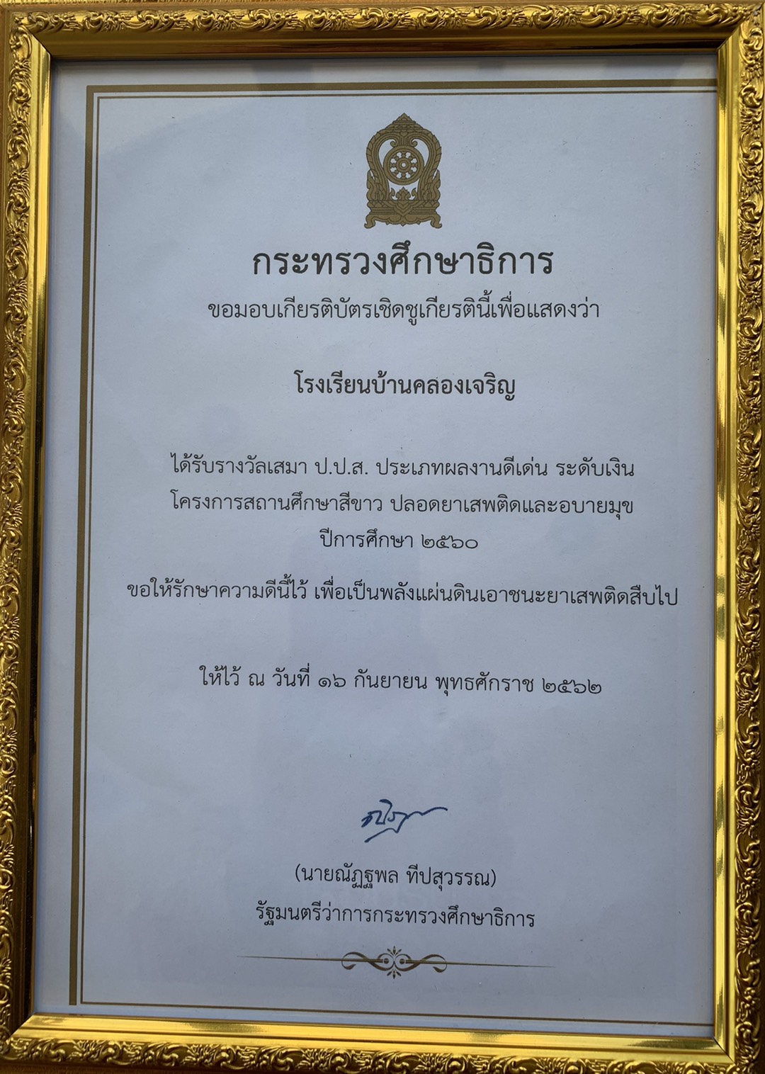 รางวัลเสมา ป.ป.ส.ประเภทผลงานดีเด่นระดับเหรียญเงินโครงการสถานศึกษาสีขาวปลอดยาเสพติดและอบายมุขปีการศึก